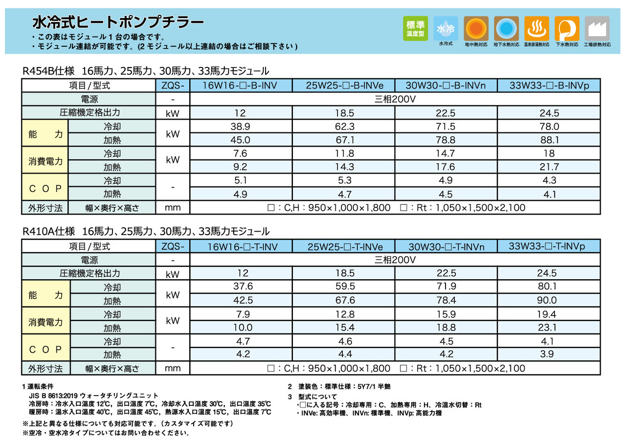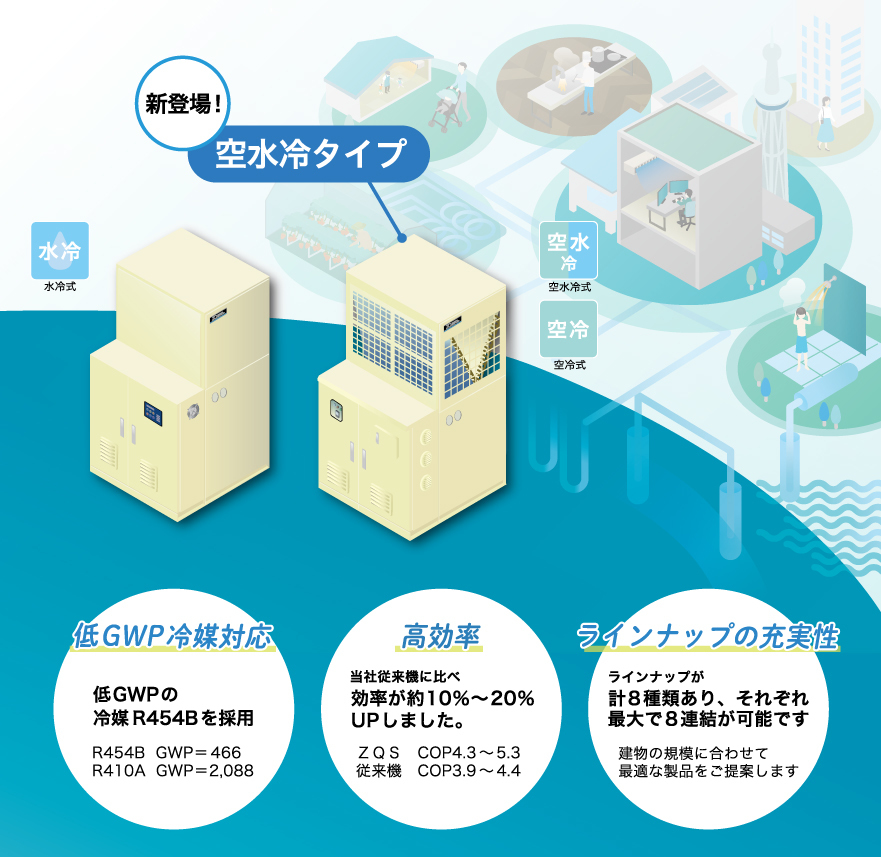 さらに、低GWP冷媒に対応した新機種も登場。冷媒はR410Aと低GWP冷媒(R454B、GWP=466)が選択できます。当社従来機と比べCOPが約10%~20%アップし、さらに省エネ効果が期待できます。また、冷暖房能力が当社従来機の約1.5倍と大きくなり、運転可能な温度範囲も広くなりました。