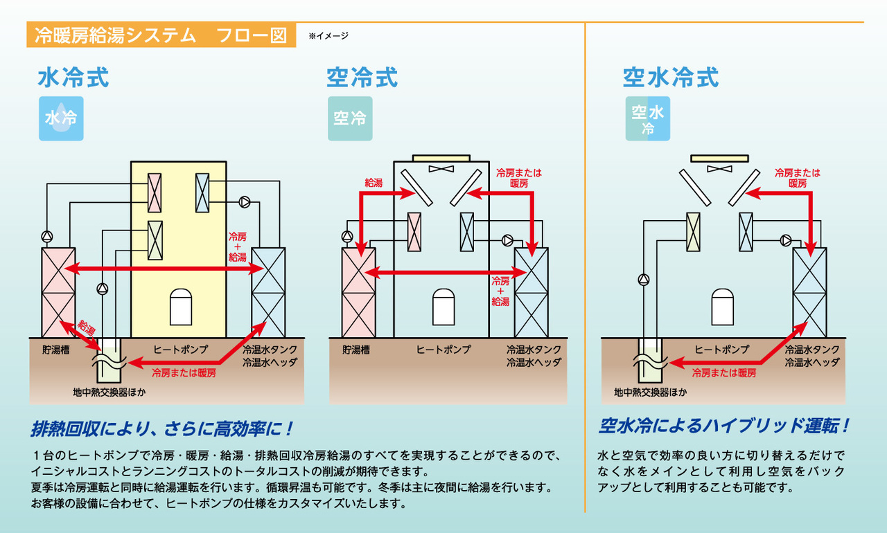地中熱、地下水熱、温泉排湯熱、下水熱、空気熱など、再生可能エネルギー熱を利用した多機能ヒートポンプです。