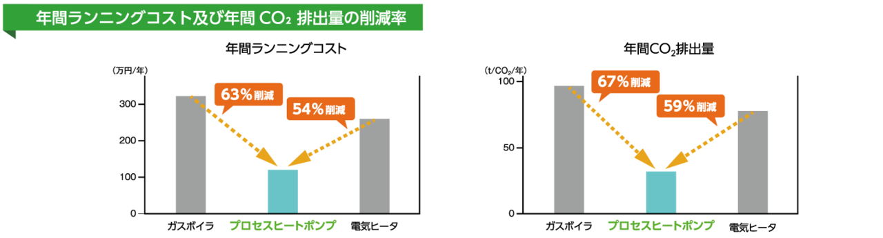工場などで使う熱といえば、使い勝手の良い「蒸気=ボイラ」という固定概念がありました。しかしながら蒸気は、配管途中での熱ロス、老朽化時の能力低下とメンテナンス負担の大きさ、CO₂排出量の多さ、可燃性燃料使用のための火災の危険性等の問題があります。そこで当社は、生産工程の常識と今一度向き合い、最新のヒートポンプ技術を活かし、工場全体の省エネ化・合理化を図り、生産工程のユーティリティを飛躍的に高める、地球環境にやさしい産業用高効率ヒートポンプ 「プロセスヒートポンプ」を誕生させました。