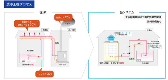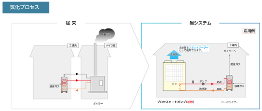 工場などで使う熱といえば、使い勝手の良い「蒸気=ボイラ」という固定概念がありました。しかしながら蒸気は、配管途中での熱ロス、老朽化時の能力低下とメンテナンス負担の大きさ、CO₂排出量の多さ、可燃性燃料使用のための火災の危険性等の問題があります。そこで当社は、生産工程の常識と今一度向き合い、最新のヒートポンプ技術を活かし、工場全体の省エネ化・合理化を図り、生産工程のユーティリティを飛躍的に高める、地球環境にやさしい産業用高効率ヒートポンプ 「プロセスヒートポンプ」を誕生させました。