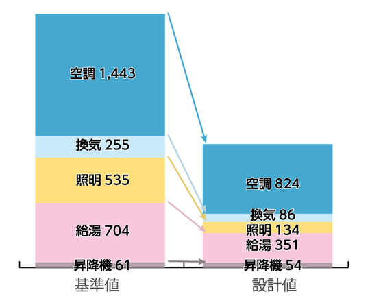 オー・ド・エクラでは、外皮性能を強化したパッシブ設計を取り入れ、地中熱ヒートポンプを利用した空調・給湯設備を採用し、エネルギー負荷低減を図っています。制御付き LED 照明設備や BEMS 装置や高効率熱源を導入し、ZEB 化の実現を目指しています。