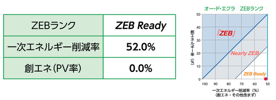ZEB(ネット・ゼロ・エネルギー・ビル)とは、快適な室内環境を保ちながら、建物の高効率化や高断熱化などによって負荷を低減し、再生可能エネルギーの導入によりエネルギー消費量を大幅に削減して、建物で消費する年間の一次エネルギーの収支をゼロにすることを目指した建物のことです。地中熱ヒートポンプを利用した空調・給湯設備等の効果により一次エネルギー削減率が52.0%となり、ZEB Readyに貢献しています。