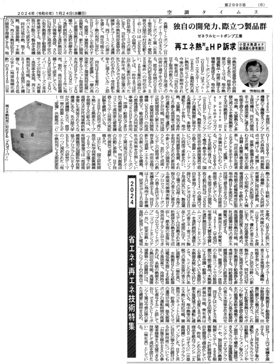 各種ヒートポンプメーカーのゼネラルヒートポンプ工業(社長=柴芳郎氏、本社・愛知県名古屋市中村区名駅2―45―14)は「ENEX2024」の会場内で、自社単独ブースでの展示に加え、当社が会員である地中熱利用促進協会の隣接したブースとも連携する。両ブースへの展示を通じて、再生可能エネルギー熱の利用に対応したHPシステムを紹介する。産業用・業務用の製品提案では、新たに開発した循環加熱HPの新機種や、人工透析治療を行う透析病院の省エネルギーに貢献する透析熱回収HPの情報を発信。さらに24年度中に発売予定の小型水熱源HP給湯器も参考展示する。独自の開発力が際立つ製品を実機やパネルで訴求する。