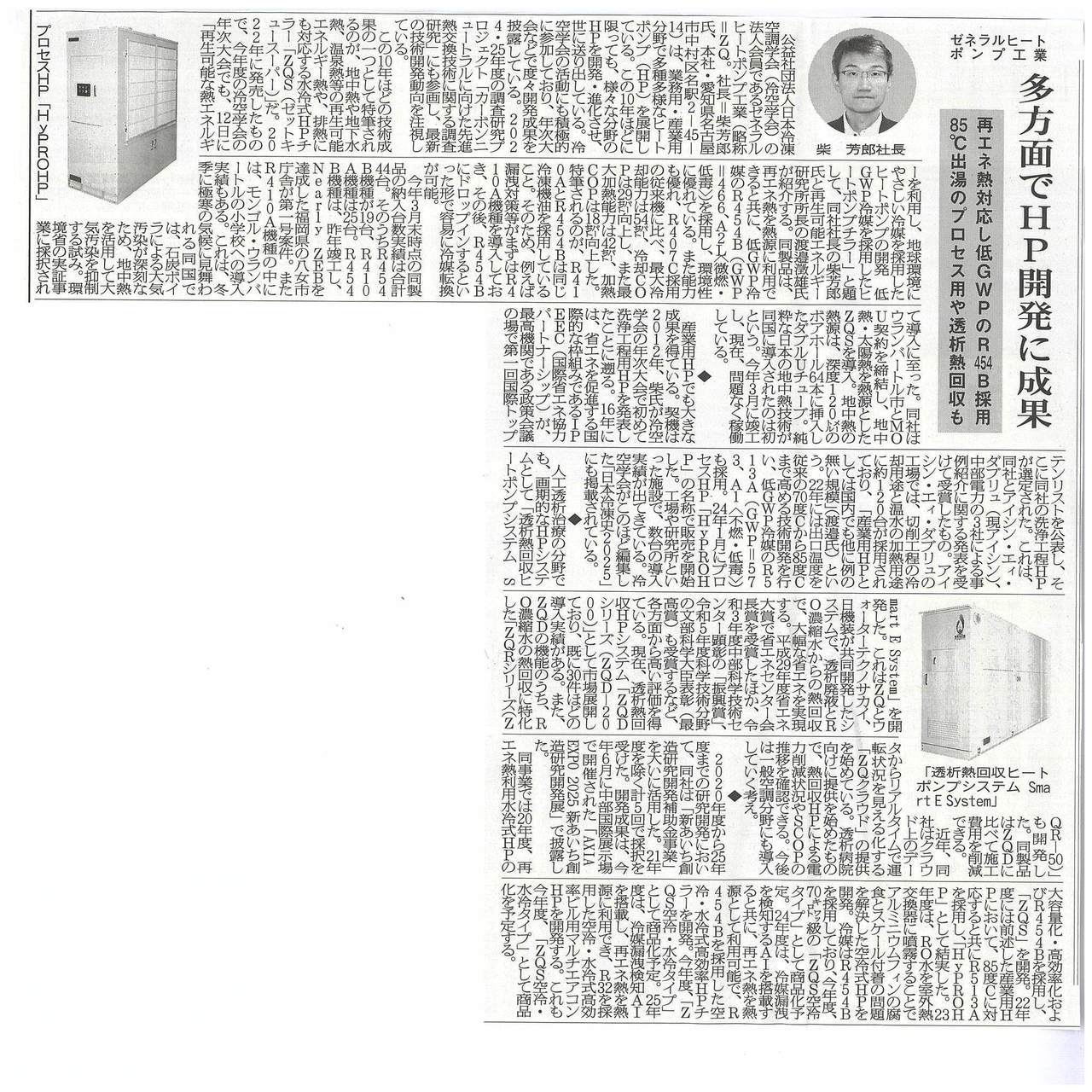 公益社団法人日本冷凍空調学会(冷空学会)の法人会員であるゼネラルヒートポンプ工業(略称=ZQ。社長=柴芳郎氏、本社・愛知県名古屋市中村区名駅2-45-14)は、業務用・産業用分野で多種多様なヒートポンプ(HP)を展開している。この10年ほどに限っても、様々な分野のHPを開発・進化させ、世に送り出している。冷空学会の活動にも積極的に参加しており、年次大会などで度々開発成果を披露している。2024・25年度の調査研究プロジェクト「カーボンニュートラルに向けた先進熱交換技術に関する調査研究」にも参画し、最新の魏ゆつ開発動向を注視している。