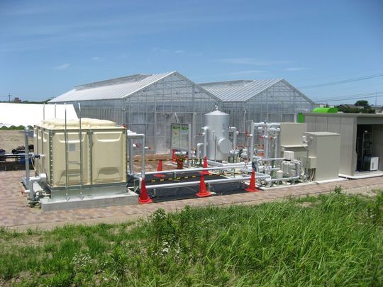 下水処理場から排水される下水処理水は、再生可能エネルギーとして利用することにより地球温暖化ガスの排出抑制につながります。ここでは下水処理場で発生する消化ガスから回収した二酸化炭素や下水処理水熱を活用し、温度や湿度、二酸化炭素濃度を制御した植物生産技術の実証試験を行っています。