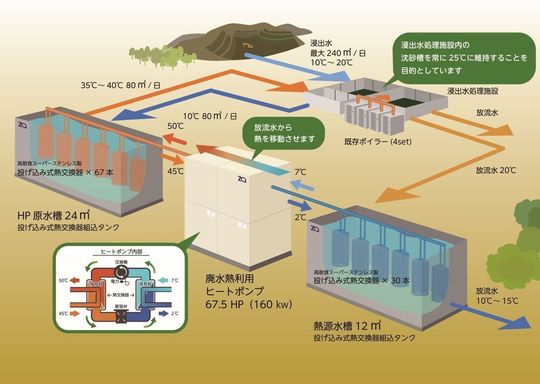 廃棄物処理場で、廃水処理熱をリサイクルして生物処理に利用しているシステムの事例です。 廃棄物の最終処分場において、埋立処理施設からの浸出水を処理する施設では、処理原水を生物処理を行うの適した温度にするために、ボイラーで一定の水温に加温を行っていました。 処理後の放流水は冬期でも20℃以上ありますが、そのまま放流していたため、この放流水の熱をヒートポンプの熱源として利用して、ヒートポンプで処理原水を加 温することで、大幅な灯油の削減、二酸化炭素の排出削減が可能になりました。