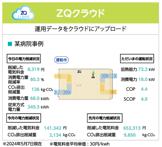 本システムは、透析排液やRO濃縮水を熱源とし、水冷式ヒートポンプとインバータ技術を駆使してRO原水を加温することにより、従来設備(電気ヒーター等)の稼働率を削減し、大きな節電効果・CO₂削減を実現しています。