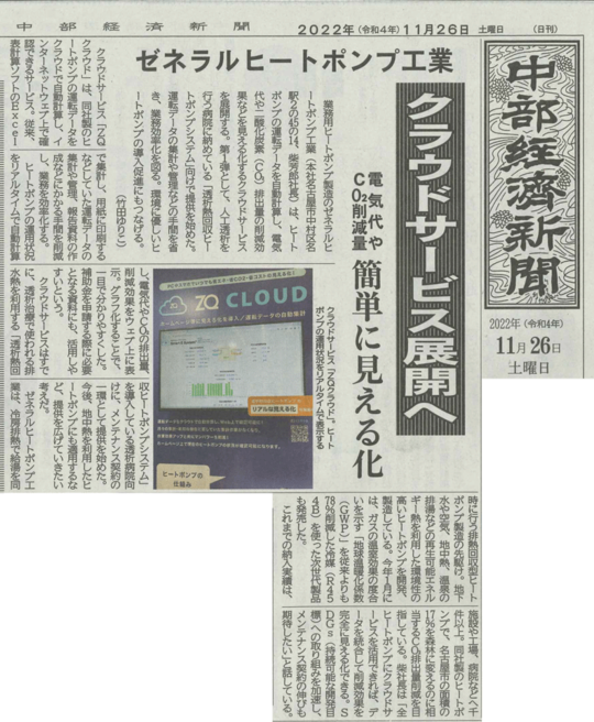 業務用ヒートポンプ製造のゼネラルヒートポンプ工業(本社名古屋市中村区名駅2の45の14、柴芳郎社長)は、ヒートポンプの運転データを自動計算し、電気代や二酸化炭素(CO2)排出量の削減効果などを見える化するクラウドサービスを展開する。第一弾として、人工透析を行う病院に納めている「透析熱回収ヒートポンプシステム」向けで提供を始めた。運転データの集計や管理などの手間を省き、業務効率化を図る。環境にやさしいヒートポンプの導入促進にもつなげる。(竹田ゆりこ)