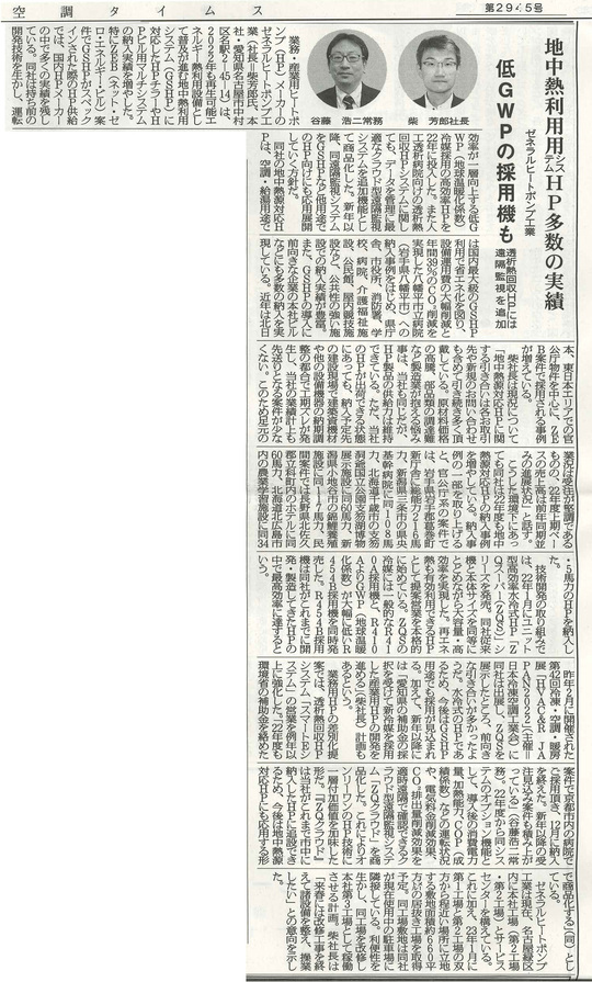業務・産業用ヒートポンプ(HP)メーカーのゼネラルヒートポンプ工業(社長=柴芳郎氏、本社・愛知県名古屋市中村区名駅2-45-14)は、2022年も再生可能エネルギー熱利用設備として普及が進む地中熱利用システム(GSHP)に対応したHPチラーやHPビル用マルチシステムの納入実績を増やした。特にZEB(ネット・ゼロ・エネルギー・ビル)案件でGSHPがスペックインされた際のHP供給では、国内HPメーカーの中で多くの実績を残している。同社は持ち前の開発技術を生かし、運転効率が一層向上する低GWP(地球温暖化係数)冷媒採用の高効率HPを22年に投入した。また人工透析病院向けの透析熱回収HPシステムに関しても、データを管理に最適なクラウド型遠隔監視システムを追加機能として商品化した。新年以降、同遠隔監視システムをGSHPなど多用途でのHP向けにも応用展開していく方針だ。